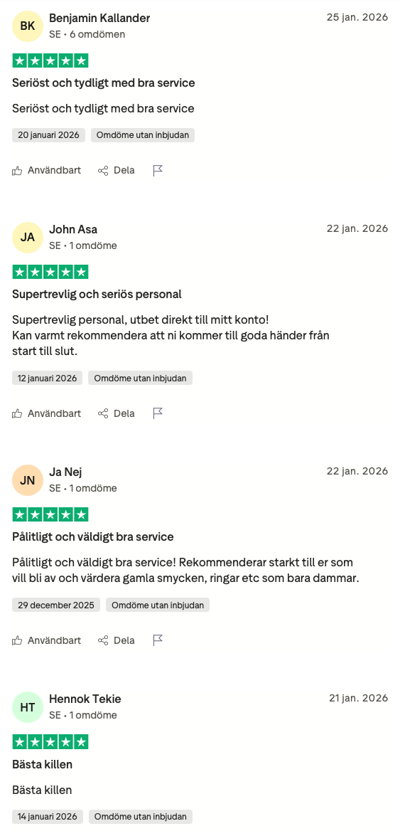Priset beräknas alltid utifrån dagsaktuella marknadspriser samt metallens vikt och renhet (karat för guld och stämplar för silver). Vi visar öppet hur priset räknas ut så att du vet exakt vad du får.